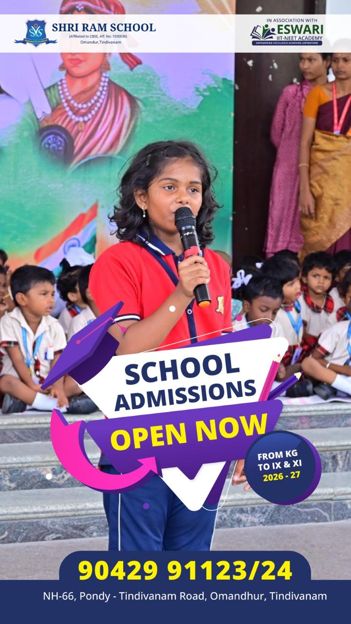 Shri Ram Senior Secondary School, established in 2014, is a premier educational institution located in Omandur, set amidst a sprawling 13 Acre 50 Cents campus that is well-connected to all parts of the city. The school operates under the aegis of the Shri Ram Trust, which is registered under the Societies Registration Act. It is affiliated to the Central Board of Secondary Education (CBSE), New Delhi, and offers a comprehensive education from Pre-KG to Class XII.